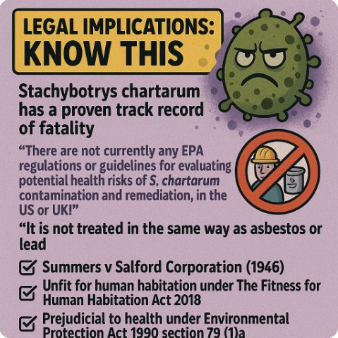 Despite Stachybotrys chartarum posing a significant risk and having a "proven track record of fatality" , it's astonishing that "there are not currently any Environmental Protection Agency (EPA) regulations or guidelines for evaluating potential health risks of S. chartarum contamination and remediation, in the US or UK!". It "is not treated in the same way AS Asbestos Lead" , and there is "no definitive guidance on eradication methods for Stachybotrys Chartarum in dwellings in the UK by Government or Industry Standards". This regulatory vacuum leaves professionals navigating what’s increasingly seen as a ‘wild west’ — one with serious consequences for health, liability, and litigation.