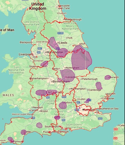 Recruitment areas for new English Housing Surveyors (updated regularly).